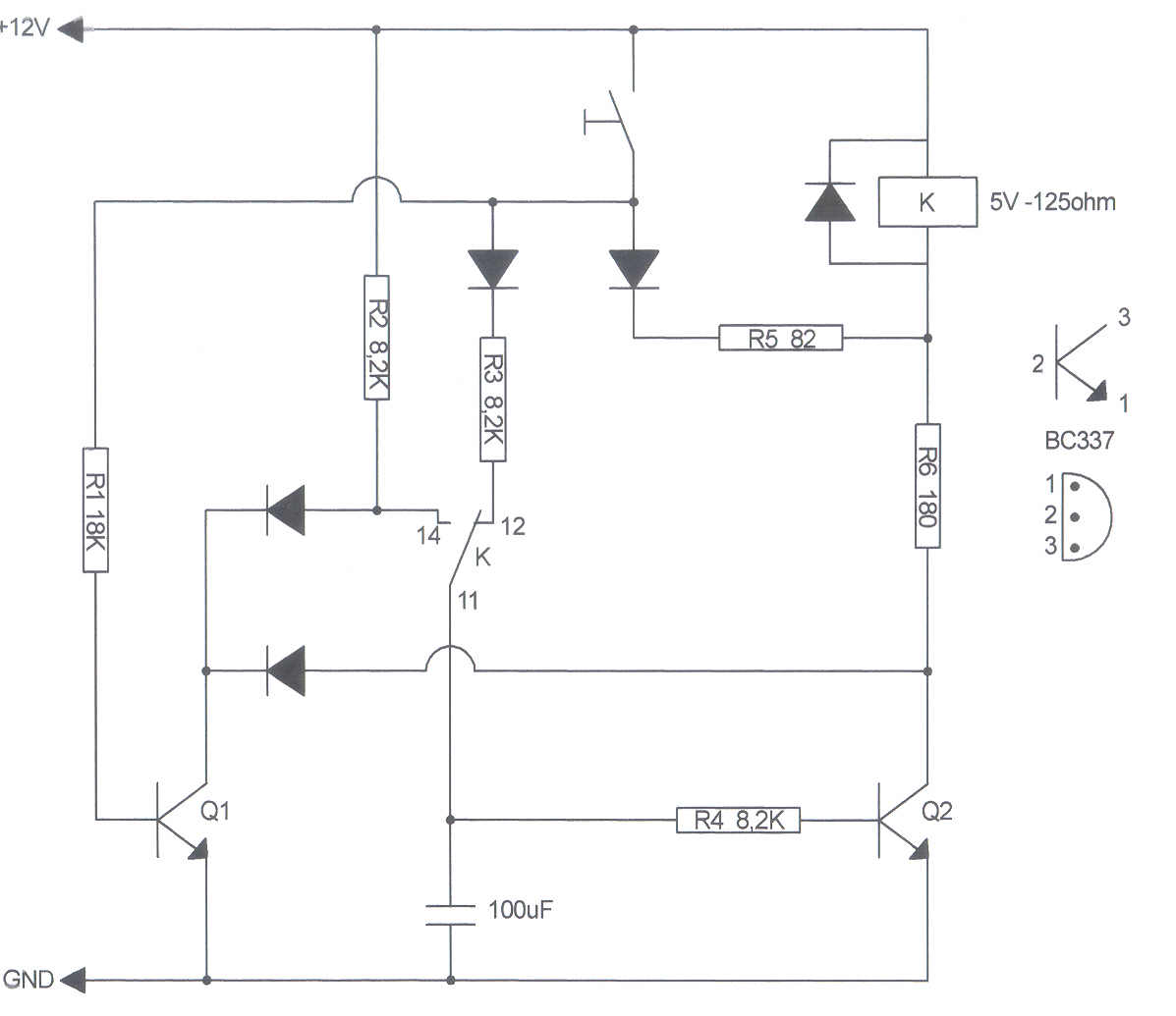 The circuit is supplied by 12 Volt DC power supply and drives a 5 Volt -125 ohm coil. When the button is pressed,